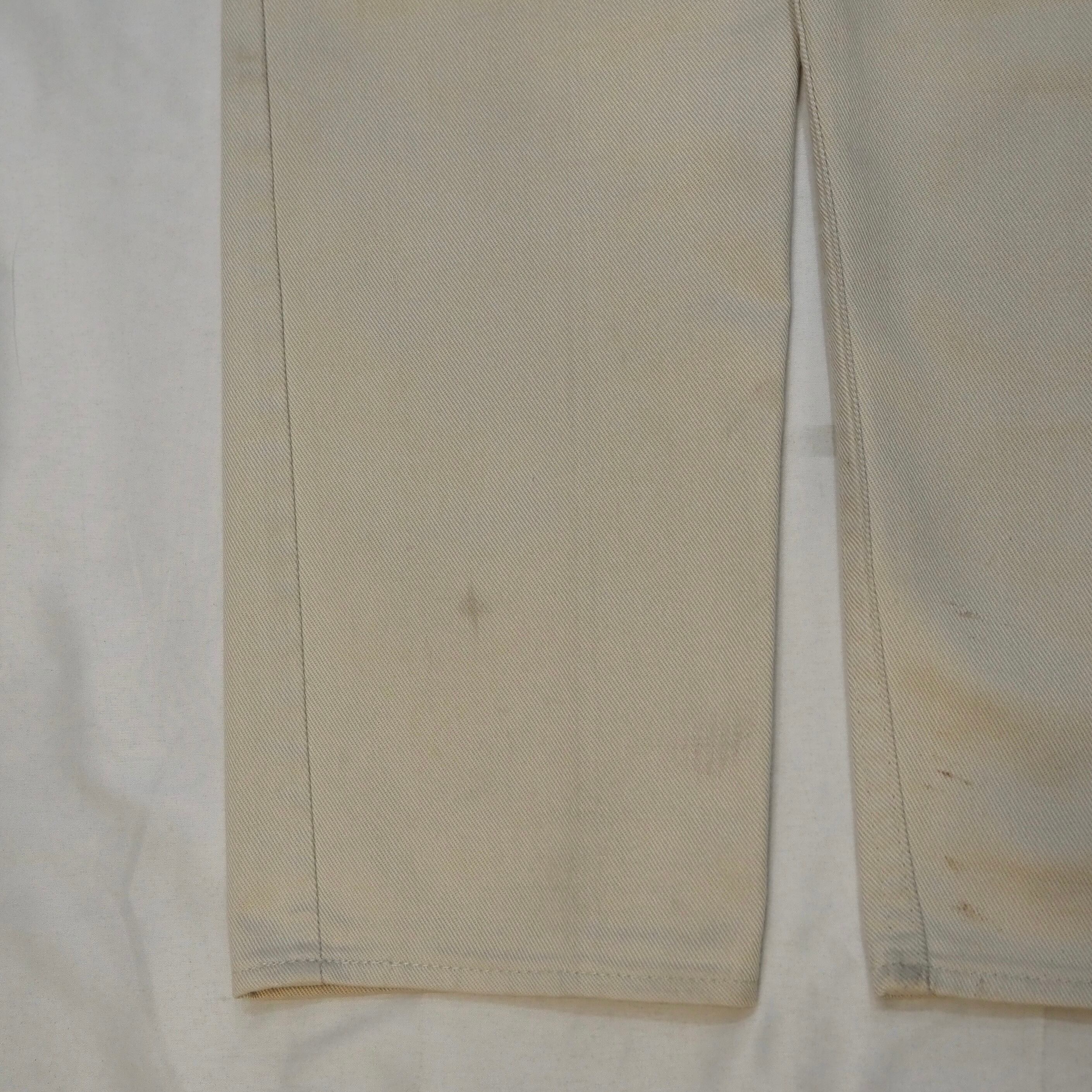 全体的にある程度の使用感あり。右バックポケット上にリペア跡があります。全体的な薄いシミや裾付近にスレによる薄い黒ずみ等がありますが、着用の際にはそれほど目立たないかと思います。