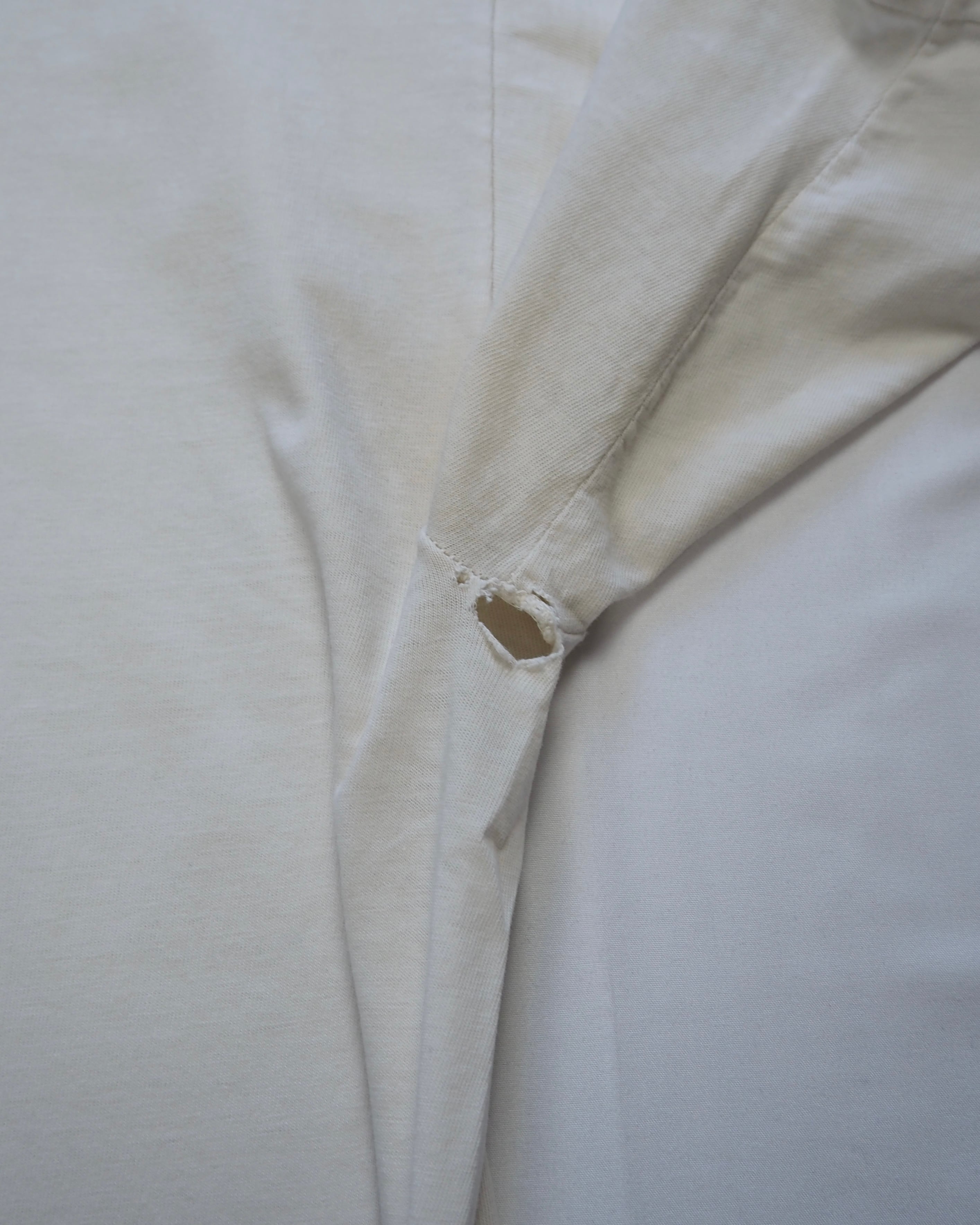 全体的にかなり使用感があります。数箇所のピンホール、両脇下破れ、首元リブほつれによる破れがあります。あくまでボロとしてお考えください。